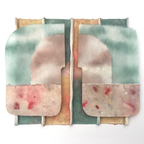 Exhibited at Richard Levy Gallery in 2023, Shifting Pitch is a series of assemblages created using painted translucent silk and watercolor on paper. The work refers to the feeling of movement, sound, and the transient quality found in nature.